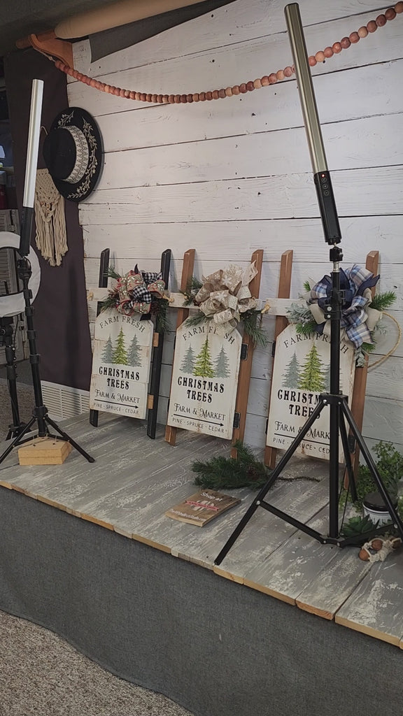 Bring rustic holiday charm to your home with this handmade Christmas sled decoration. Crafted from recycled pallet wood and hand painted with aged details, it features a festive "Farm Fresh" tree sign, pine tree artwork, a large handmade bow with decorative greens. Measuring 29" tall by 16" wide, this one-of-a-kind sled is the perfect statement piece for your porch, entryway, or holiday display.
