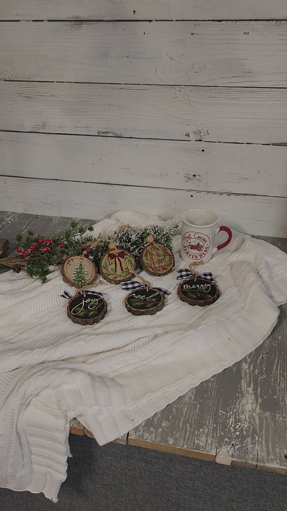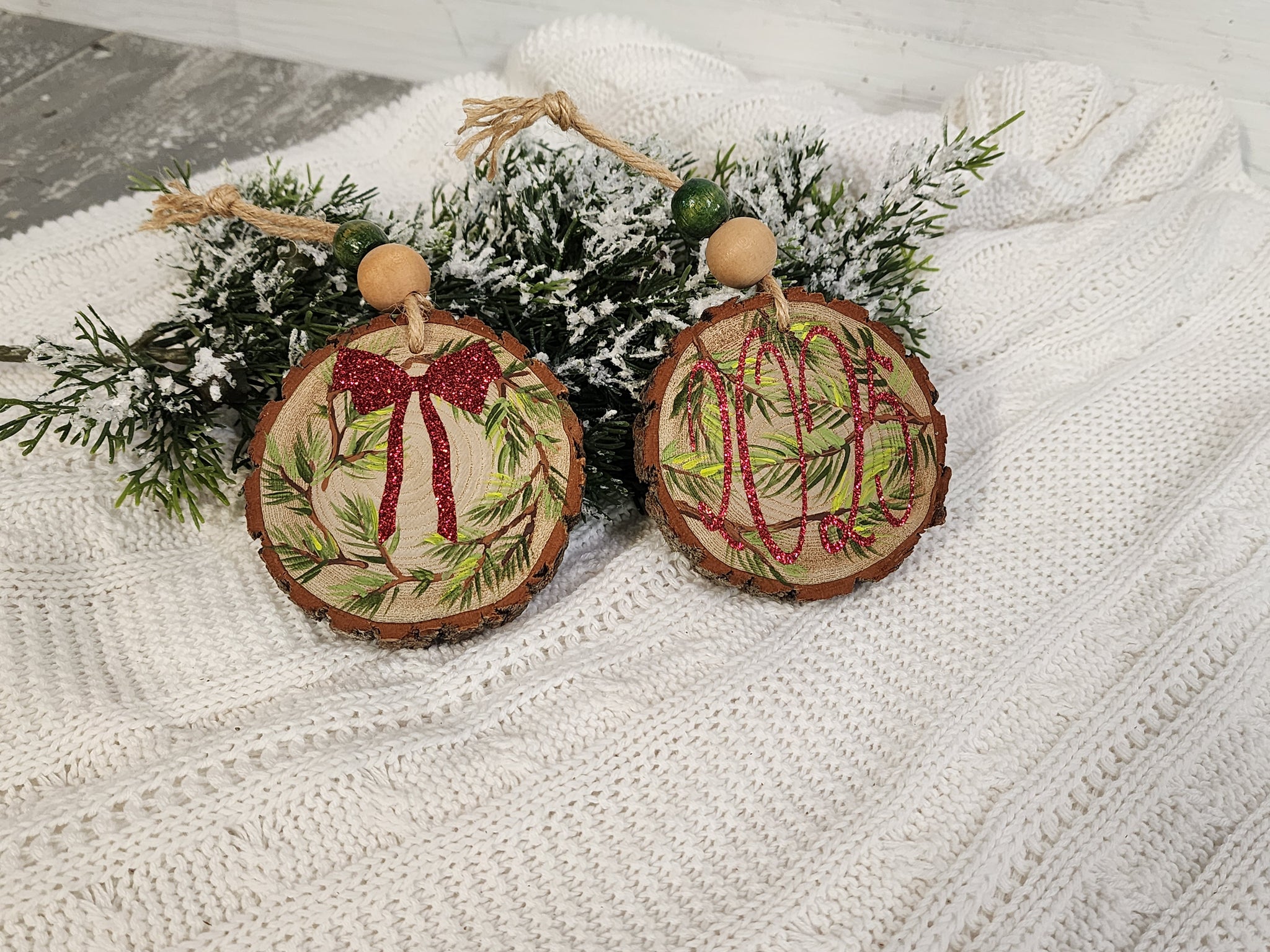 Are you looking for the perfect, handmade Christmas wood slice ornament?  It can also be used as an accent for a Christmas wreath or coffee bar decor.  I cut this wood slice myself, painted pine branches and added a glitter HTV "2025".  This ornament would also make a thoughtful, personal gift or even a decorative tag on a wrapped Christmas gift.