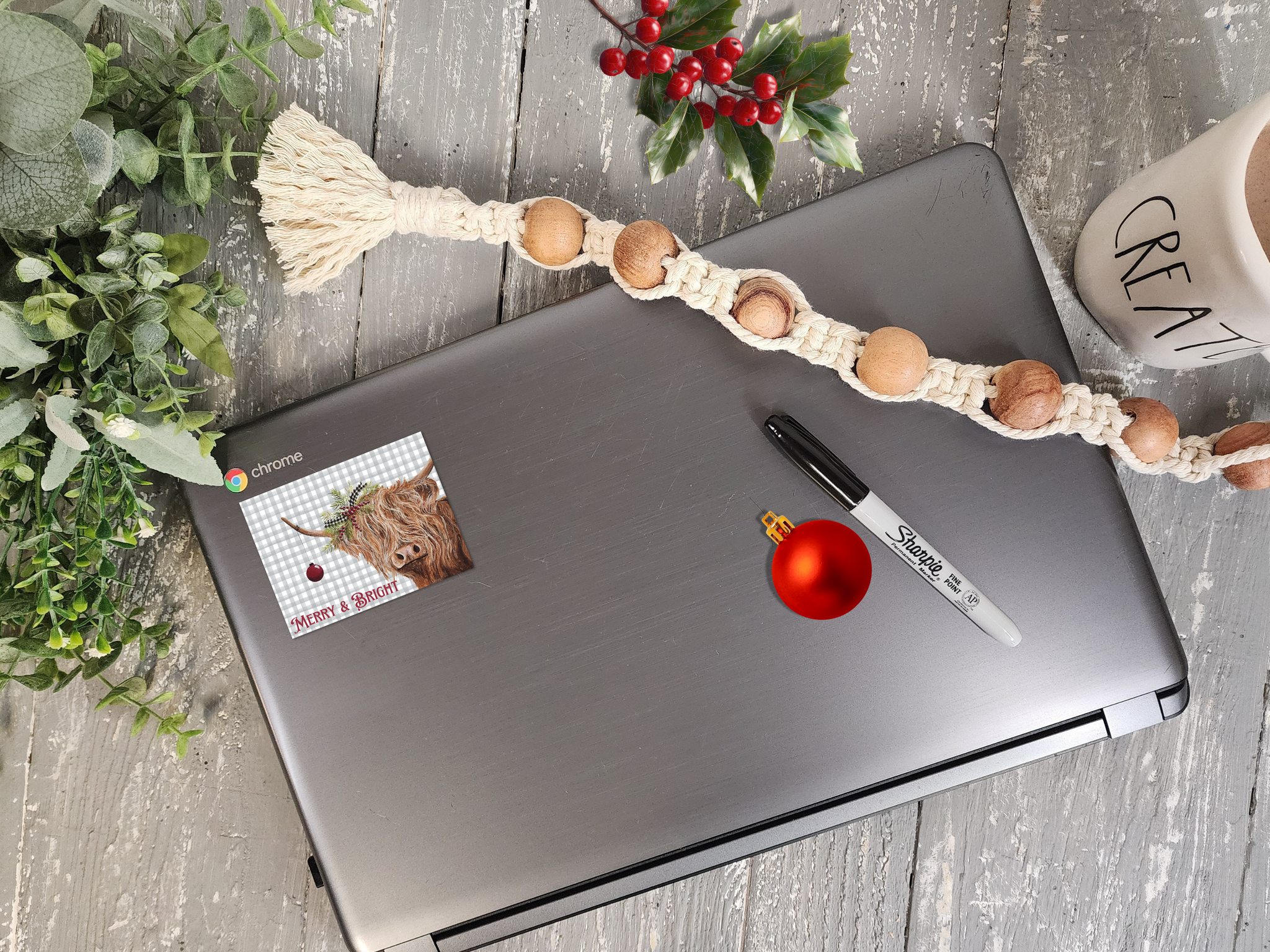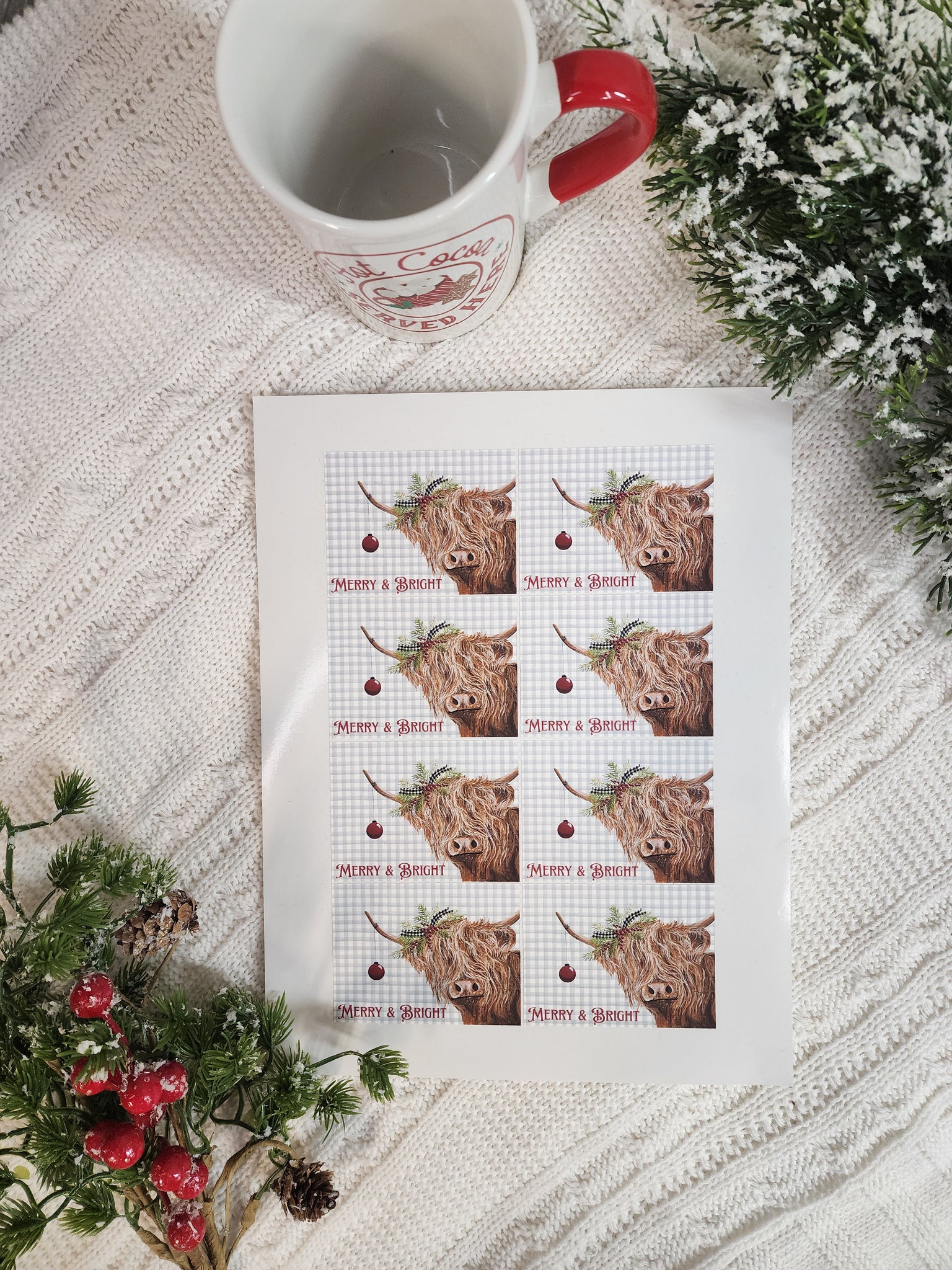 Christmas highland cow stickers, Vinyl artwork sticker sheet, Laptop sticker, Holiday card seal, Merry & Bright gray buffalo plaid