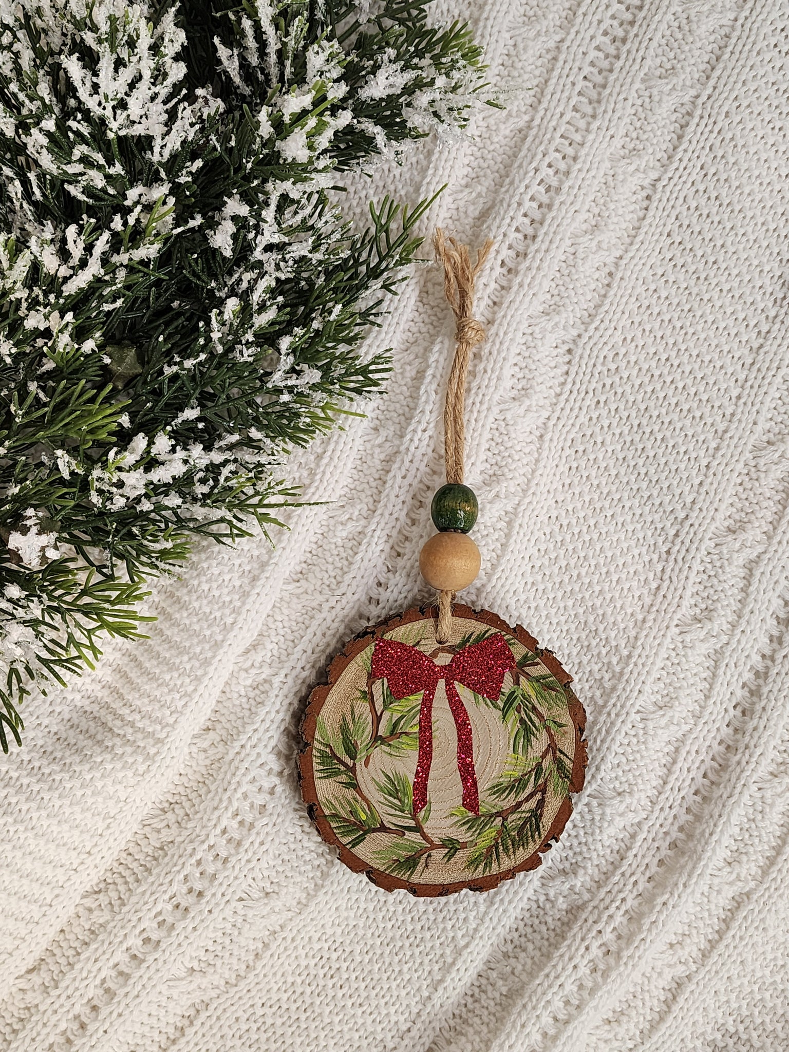Christmas wreath Wood Slice Ornament: natural hand painted Holiday Decor, Personalized custom Christmas tree decorations