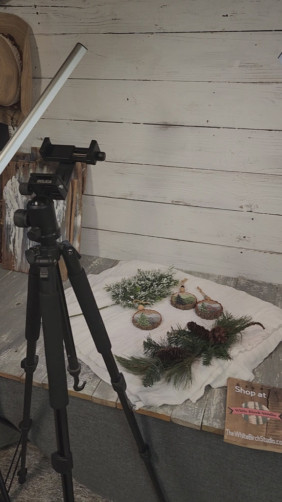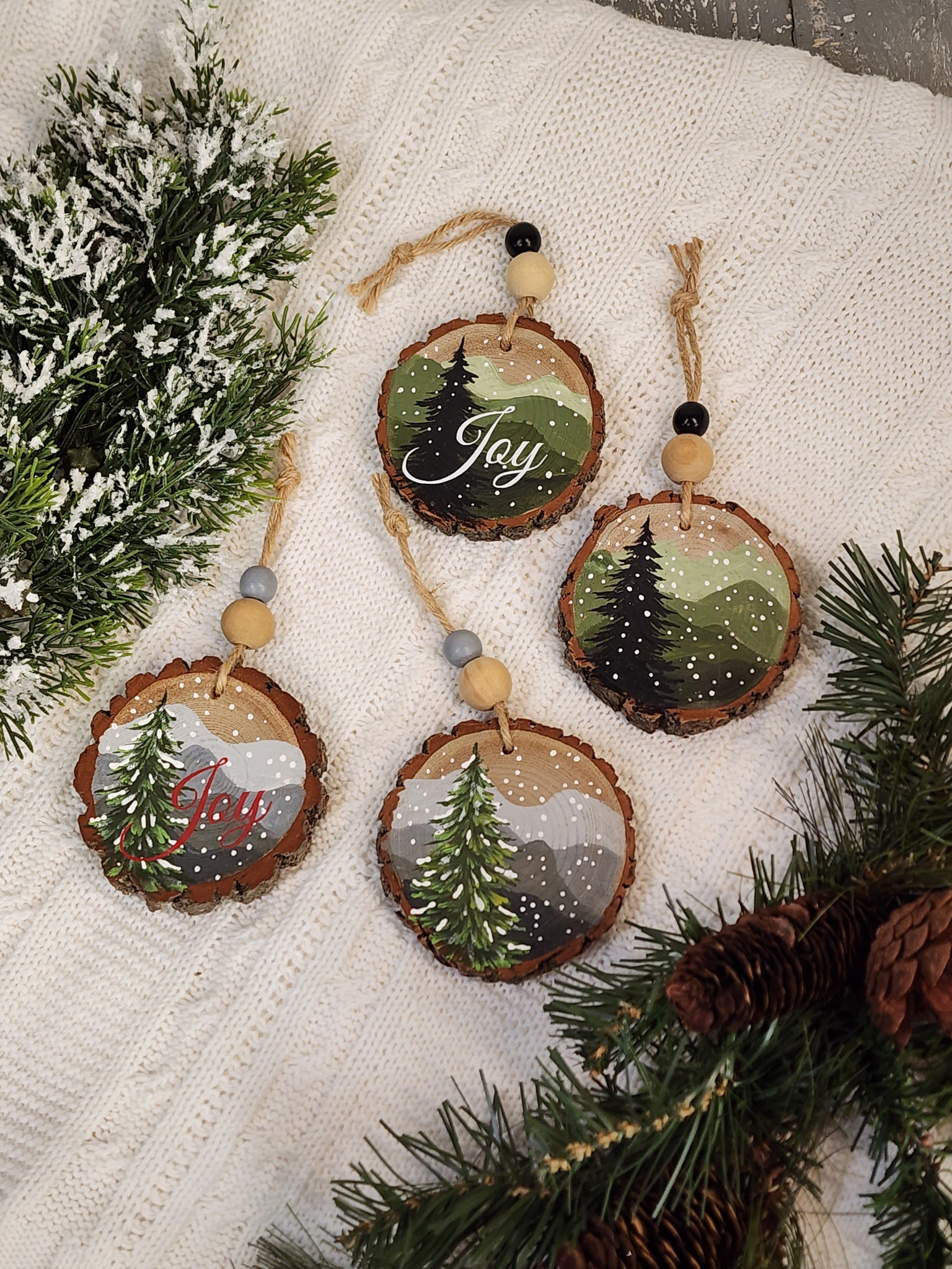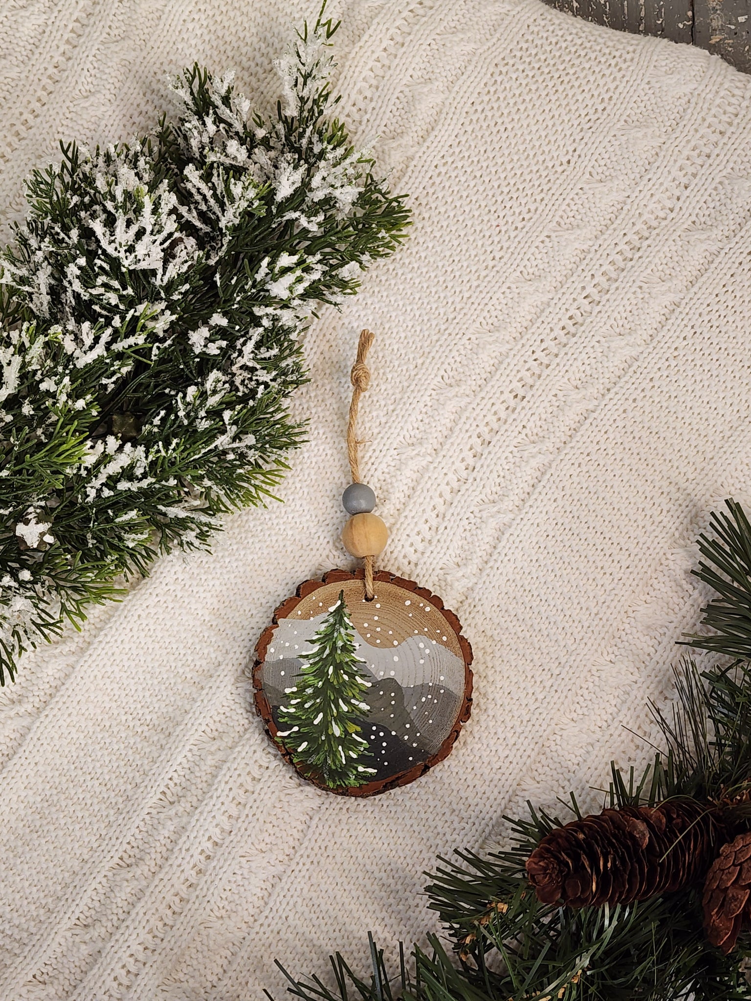 Bring cozy winter charm to your holiday décor with this handmade wood slice ornament. Each piece is hand-cut and individually painted with layered gray mountains, a snowy sky, and a classic pine tree scene.  Finished with rustic jute twine and a natural wood bead, this ornament is perfect for nature lovers, cabin décor, or gifting. Lightweight, unique, and full of woodland winter magic!