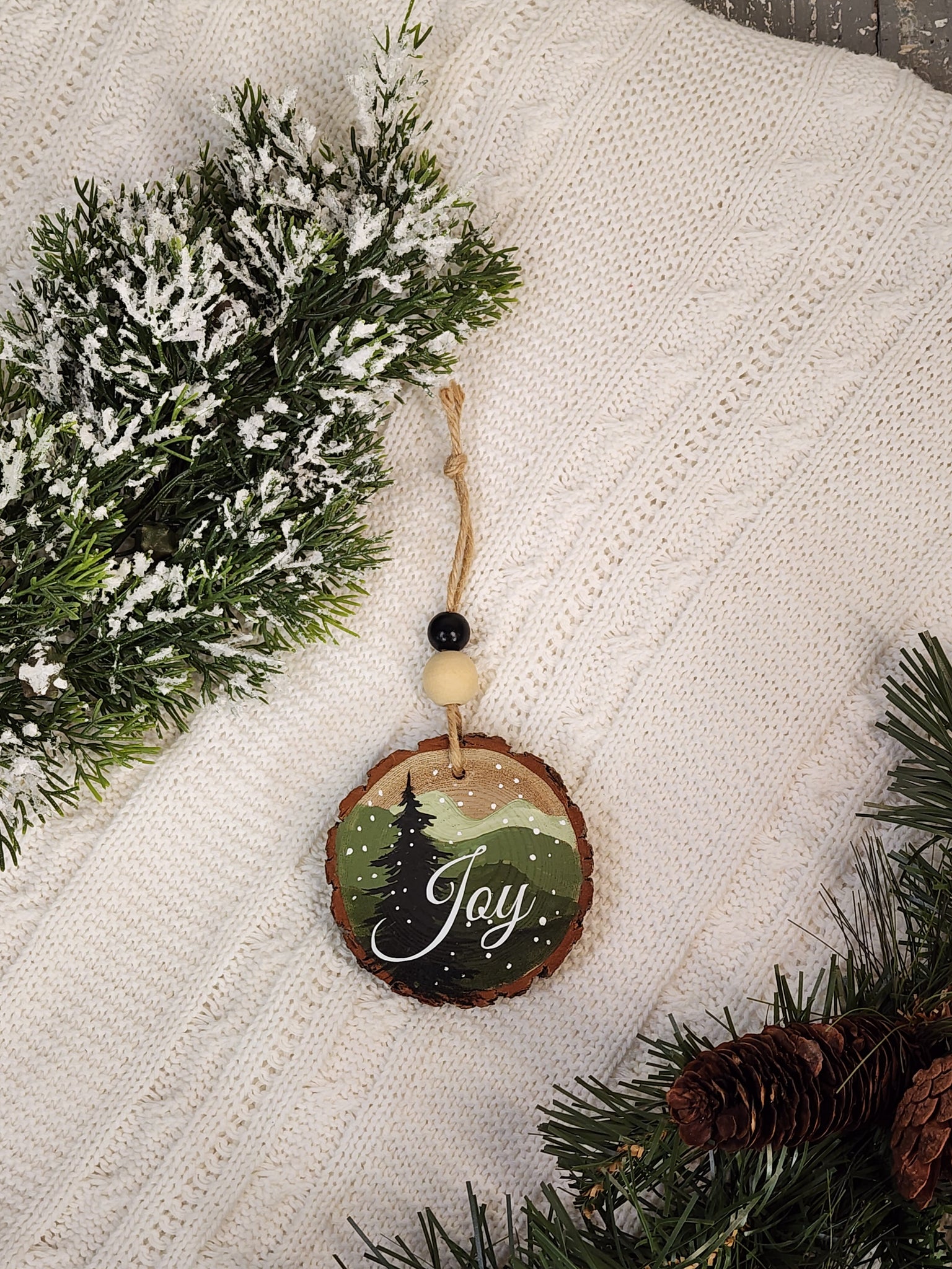 Hand-Painted Mountain Wood Slice Ornament • Rustic green mountains with JOY • Snowy Pine - Nature Christmas Decor • Handmade Holiday Gift