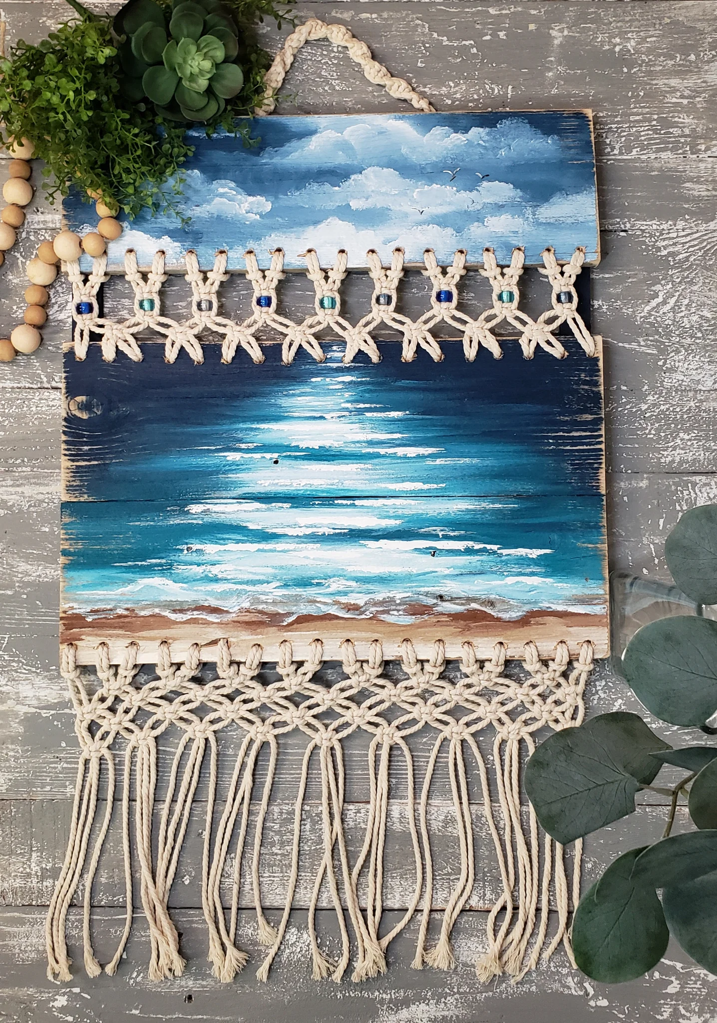 Beach lover Christmas gift set for her, acrylic beach painting on recycled pallet wood, boho macrame, recycled beach bag made from quilt