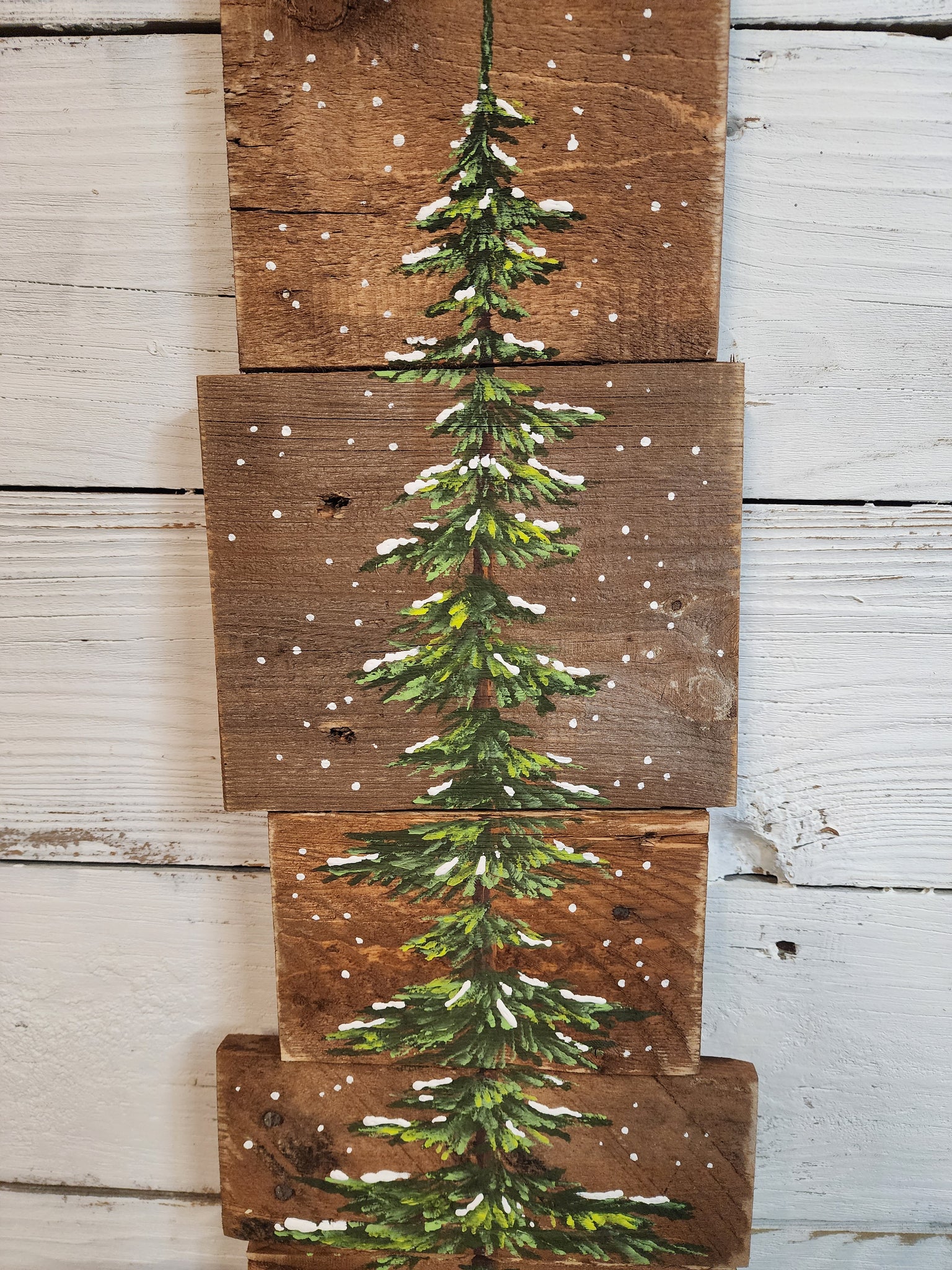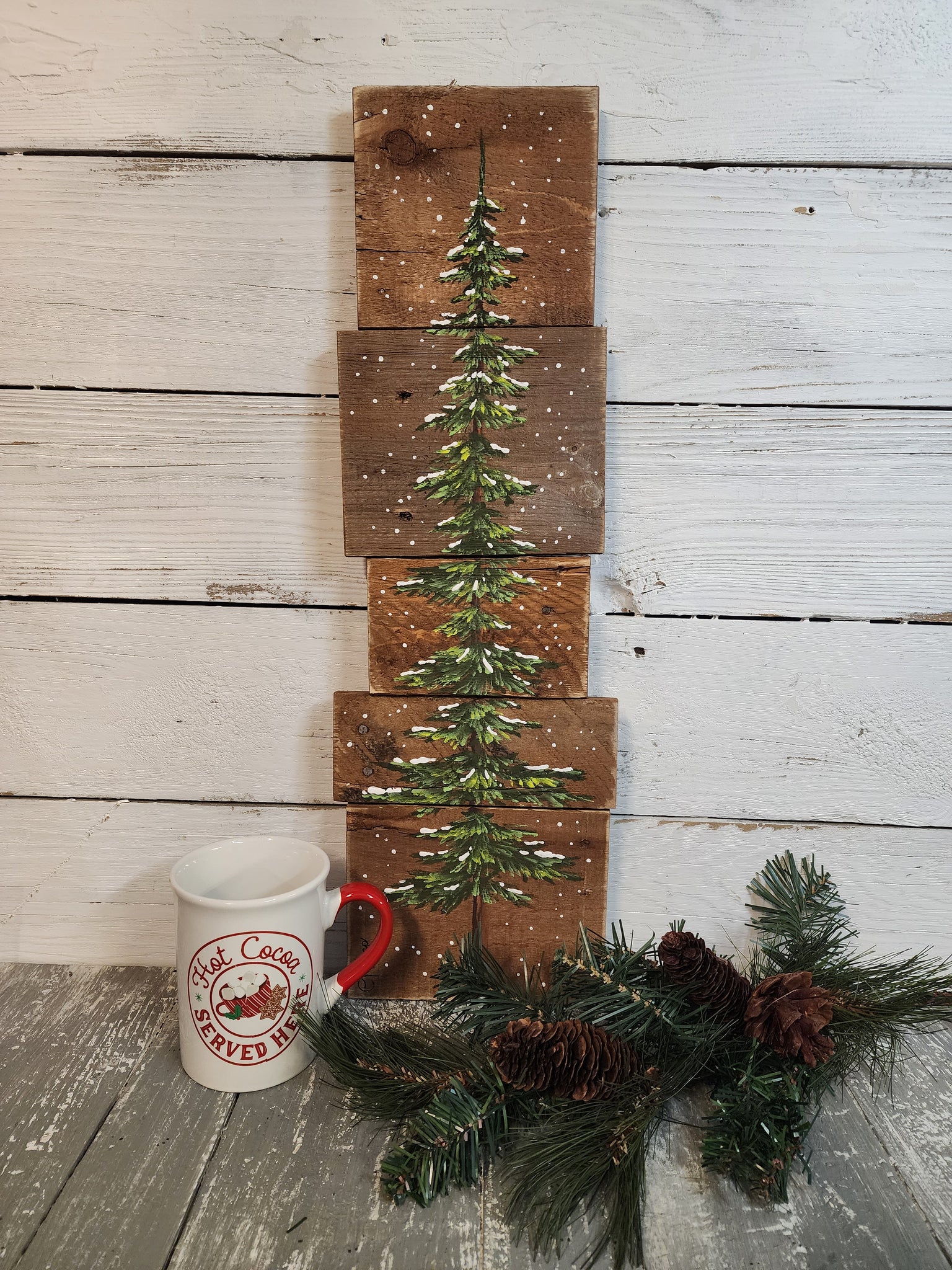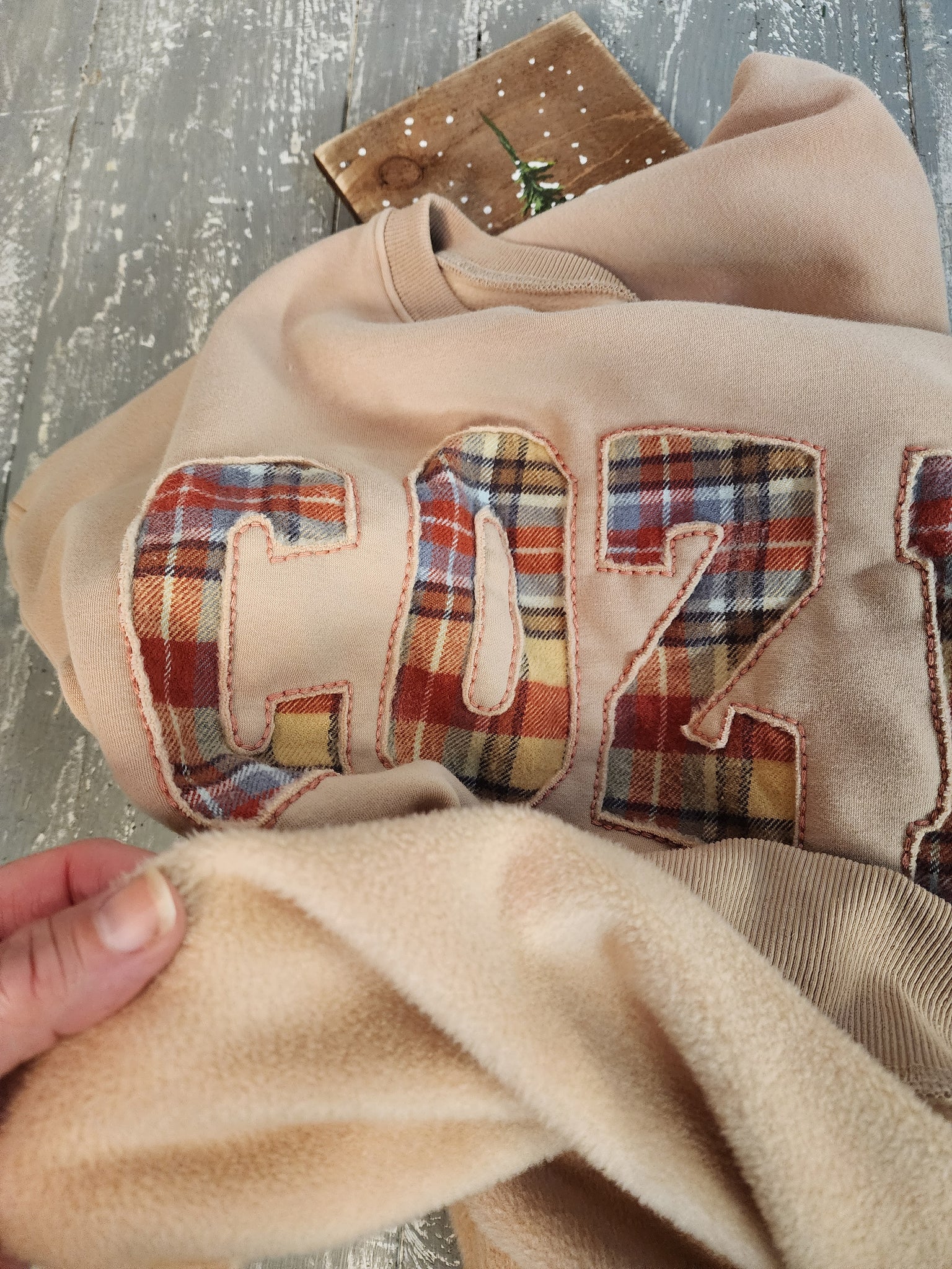 Handmade with love, this 2-piece gift set is the perfect blend of cozy, creative, and meaningful gift. It includes a super soft, fuzzy tan crew sweatshirt (L) with hand-embroidered "COZY” in warm tone flannel plaid, and a one-of-a-kind piece of pallet wood art with a hand painted pine tree in the snow.  Perfect for Christmas and winter decorating.  Beautifully gift-wrapped with a handmade bow—ready to give or treasure yourself.