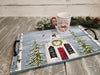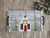 Decorative Christmas serving tray, snowy holiday church with Christmas trees and white birch, Christmas cardinal
