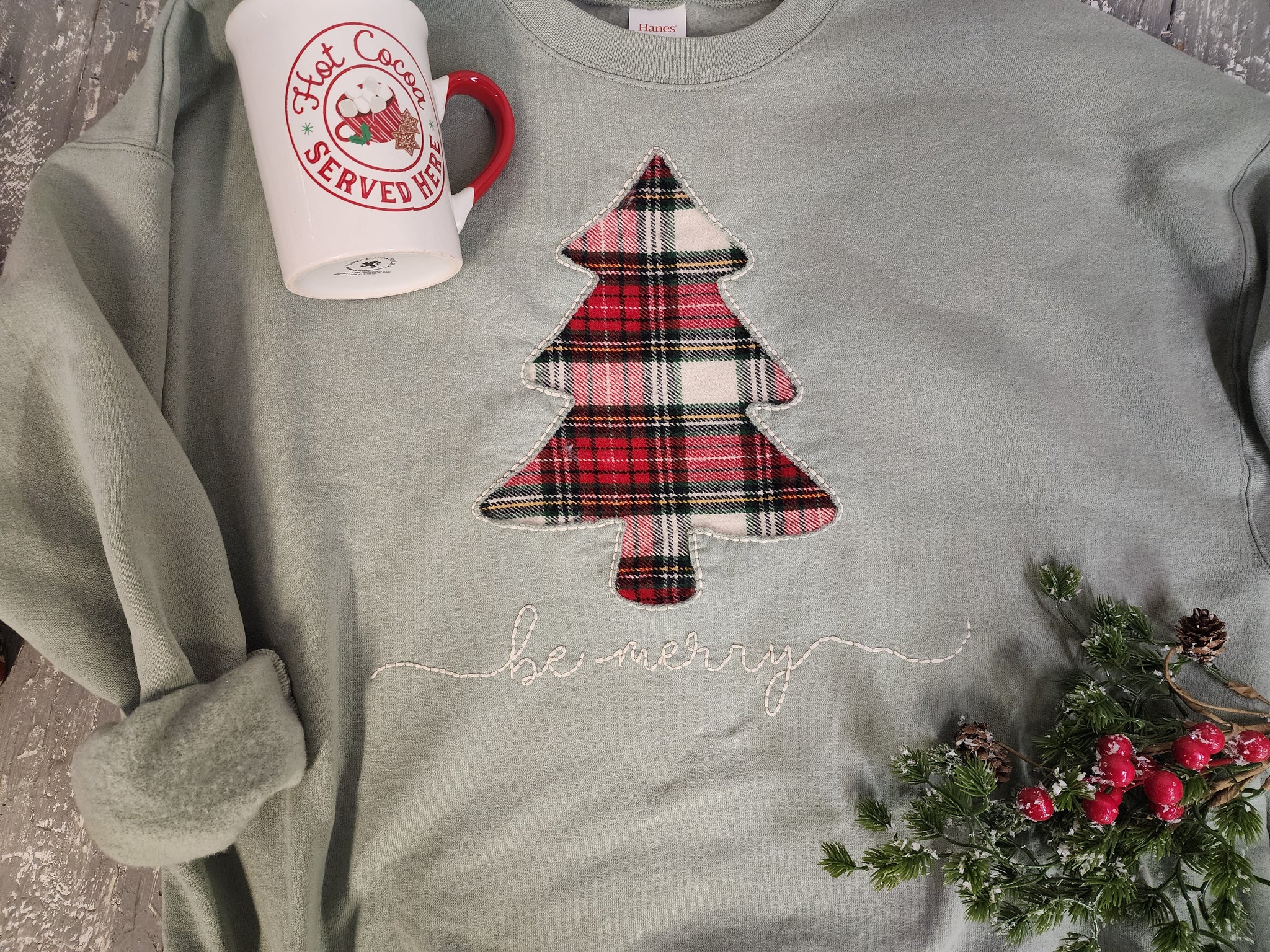 Christmas cozy crew sweatshirt with plaid Christmas tree, XL sage green, homemade gift for her, handmade merry shirt for the holidays