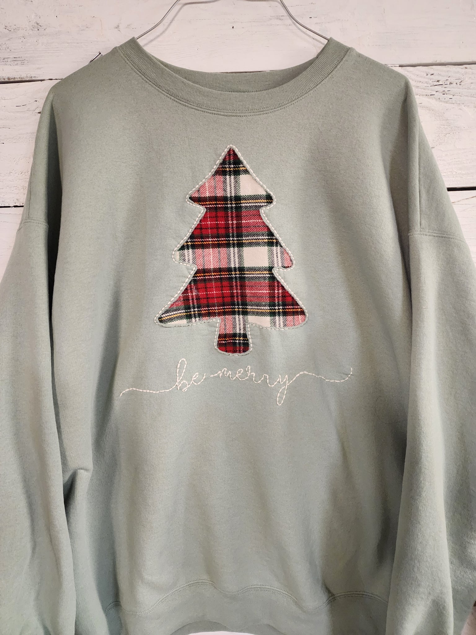 Celebrate the season in cozy style with this one-of-a-kind, handmade crewneck sweatshirt. Crafted on a soft sage green crew (size XL), this festive piece features a hand-embroidered red Christmas flannel plaid tree silhouette with the word “merry” elegantly stitched beneath in cream embroidery floss.